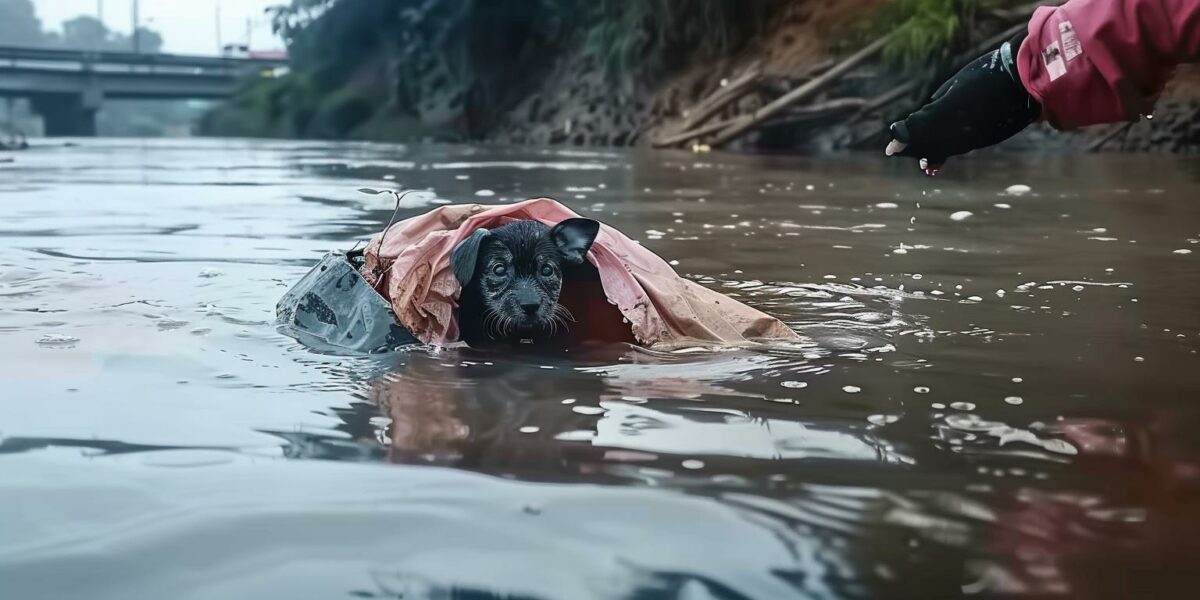 In a chilling encounter that would tug at the heartstrings of any animal lover, a helpless puppy was discovered in the most harrowing circumstances. Nestled among discarded trash and teetering on the brink of death, this innocent soul was found inside a sealed garbage bag, floating aimlessly down a cold, indifferent river. The sight was one of pure misery and desperation.